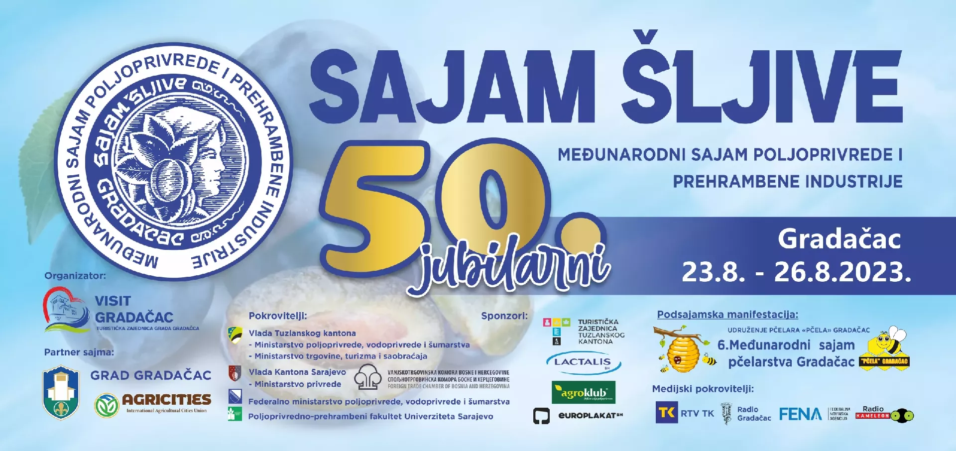 Jubilarni 50. međunarodni sajam poljoprivrede i prehrambene industrije - Sajmu šljive u Gradačcu održat će se od 23. do 26.08.2023. godine. Na sajmu će se održati niz stručnih predavanja, kolektivnih izložbi, prezentacija proizvoda iz područja poljoprivrede i prehrambene industrije, male privrede i kućne radinosti.