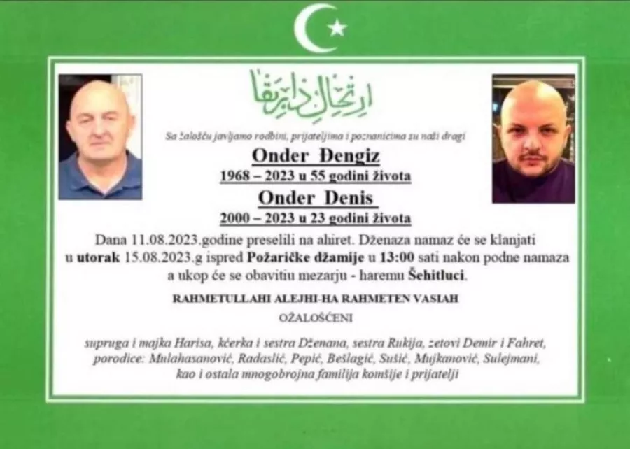 (Patria) - Otac i sin Đengiz i Denis Onder, koje je u petak u Gradačcu ubio Nermin Suljemanović, bit će ukopani danas na mezarju - haremu Šehitluci, a dženaza će biti klanjana ispred Požaričke džamije u Gradačcu u 13 sati.