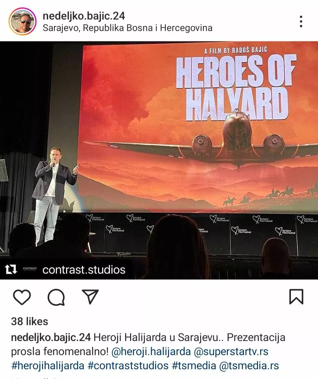 "Sporni film nije prikazan na Sarajevo Film Festivalu. U okviru biznis prezentacije kompanije Telekom Srbije na poslovnom forumu Festivala, najavljen je između njihovih ostalih novih projekata, i film koji je još uvijek u postprodukciji - „Heroji Halijarda“. Date su osnovne informacije o projektu i prikazana tri inserta snimljenog materijala pred oko 70 prisutnih učesnika. Sadržaj prezentacije je bio isključiva odgovornost Telekoma Srbije.