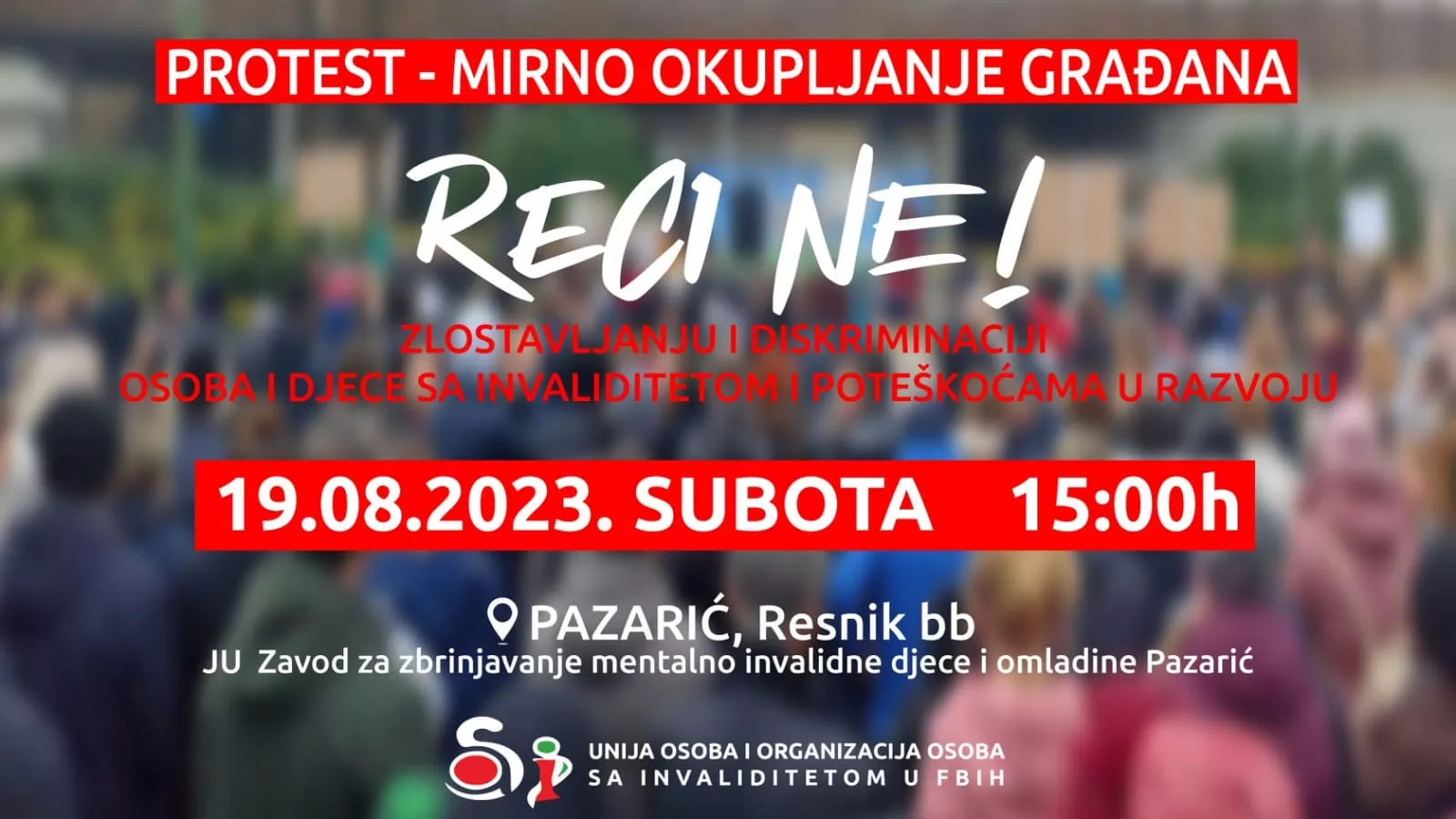 (Patria) - Unija osoba i organizacija osoba sa invaliditetom i poteškoćama u razvoju organizirat će protest u subotu 19. avgusta s početkom u 15 sati u Pazariću kod Zavoda Pazarić koji potresa nova afera zlostavljanja štićenika.