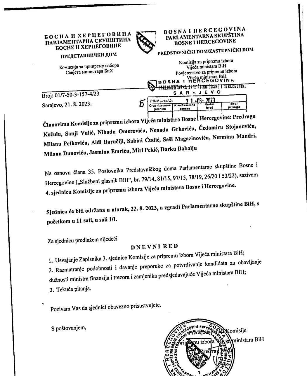 Nažalost, sjednica Vijeća ministara umjesto prije sjednice Parlamenta je zakazana za dan poslije. Jedino što smo dobili kao dodatni materijal je prijedlog imenovanja novog ministra.