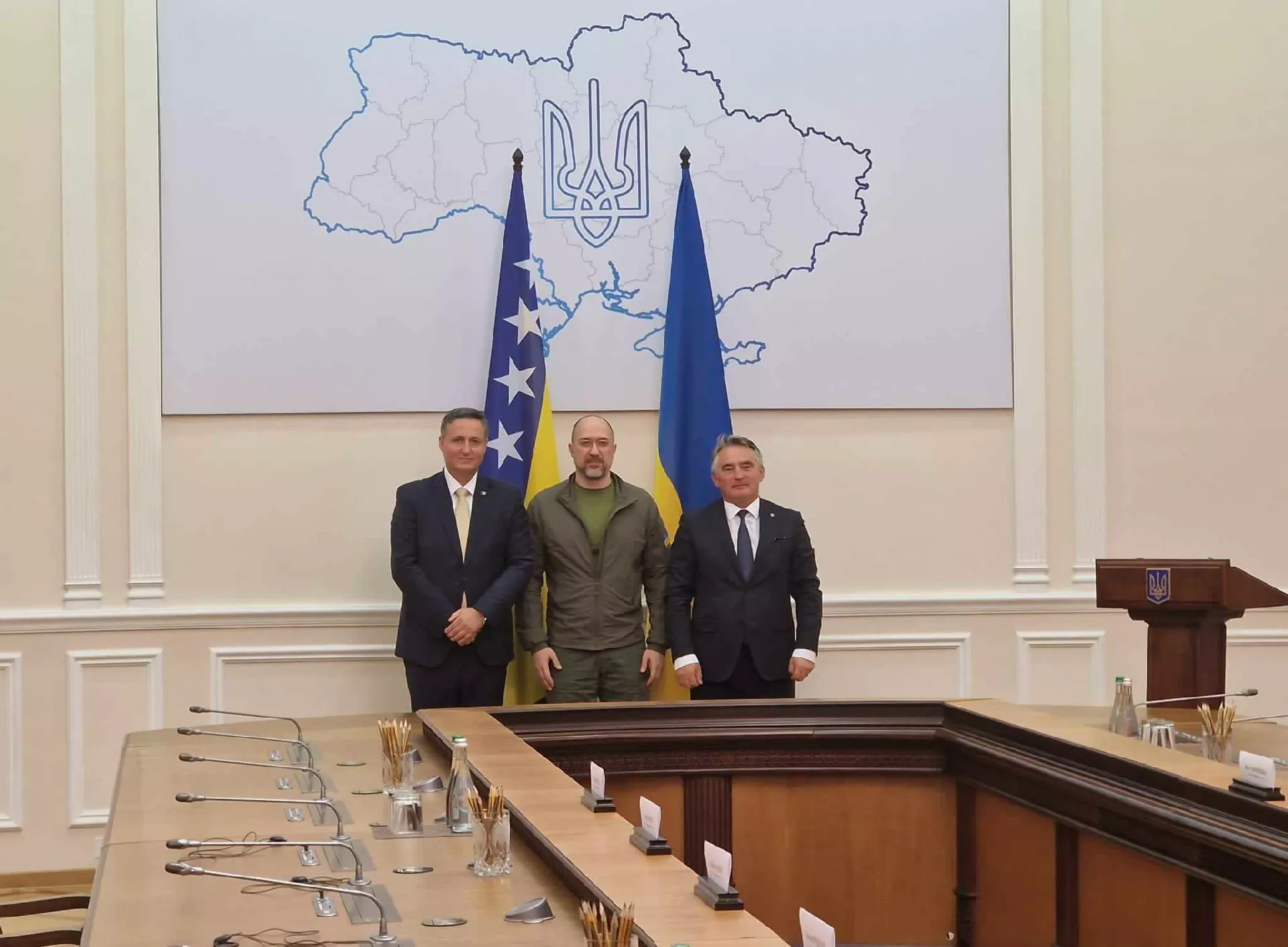 Nakon jučerašnjeg sastanka sa predsjednikom Volodimirom Zelenskim koji se zahvalio na dolasku i podršci Komšiću i Denisu Bećiroviću, danas su održali sastanak sa premijerom Ukrajine Denisom Šmihalom.