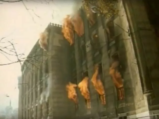 (Patria) - Sarajevska Vijećnica, simbol grada i jedan od najreprezentativnijih i najljepših objekata iz austrougarskog perioda, za vrijeme opsade Sarajeva više puta je bila granatirana, a 25. avgusta 1992. godine granate ispaljene s položaja Vojske Republike Srpske prouzrokovale su veliki požar u kojem je unutrašnjost objekta u potpunosti izgorjela.