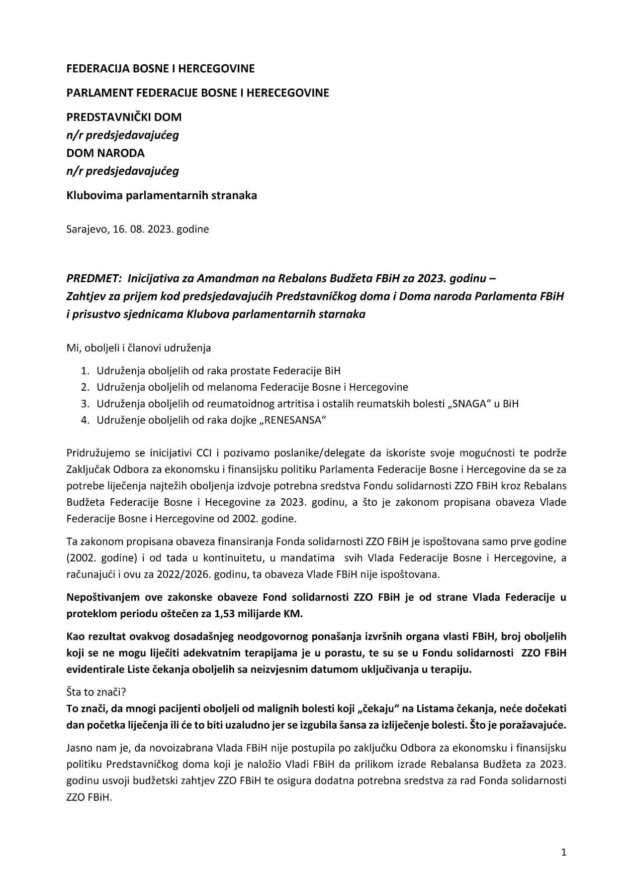 Zahtjev koji su udruženja uputila Parlamentu FBiH - 1. dio (Foto: Facebook)