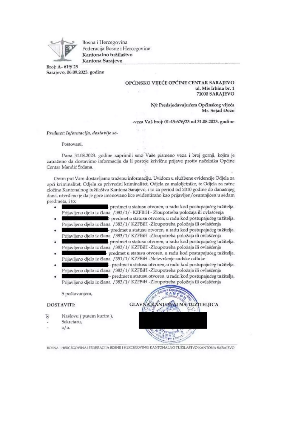 S obzirom da načelnik ne želi da provede presudu Ustavnog suda FBiH koja se odnosi na organizaciju i sistematizaciju radnih mjesta, te da su u proteklom periodu pojedini vijećnici, ali i uposlenici pozivani u Tužilaštvo Kantona Sarajevo zbog određenih postupaka koji se dešavaju u Općini Centar prema Tužilaštvu Kantona Sarajevo je upućen zahtjev za dostavu informacija da li su i koji postupci pred ovim organom pokrenuti, a koji se odnose na općinskog načelnika.