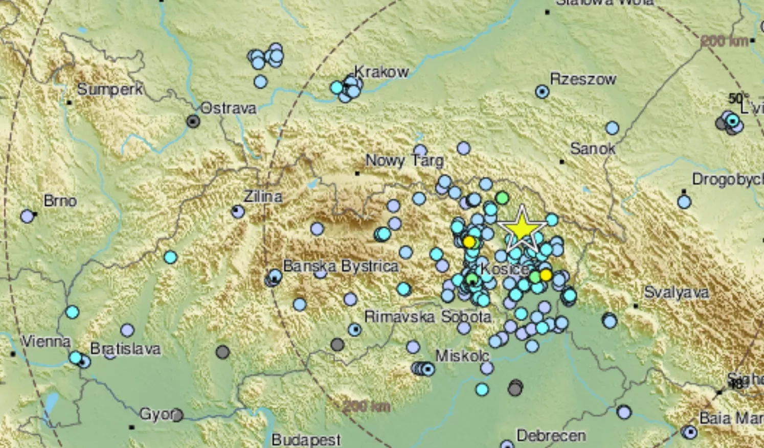 #Earthquake 18 km NW of #Humenné (#Slovakia) 22 min ago (local time 20:23:09). Updated map - Colored dots represent local shaking & damage level reported by eyewitnesses. Share your experience via: