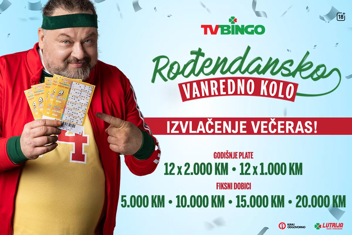 Rođendanski TV Bingo obećava dobru zabavu ali i šansu za osvajanje dodatnih vrijednih novčanih dobitaka; godišnja TV Bingo plata u iznosu od 1 X 24.000,00 KM i 1 X 12.000,00 KM koja će biti isplaćena u jednakim mjesečnim iznosima, te 1 X 20.000,00 KM, 1 X 15.000,00 KM, 1 X 10.000,00 KM i 1 X 5.000,00 KM.