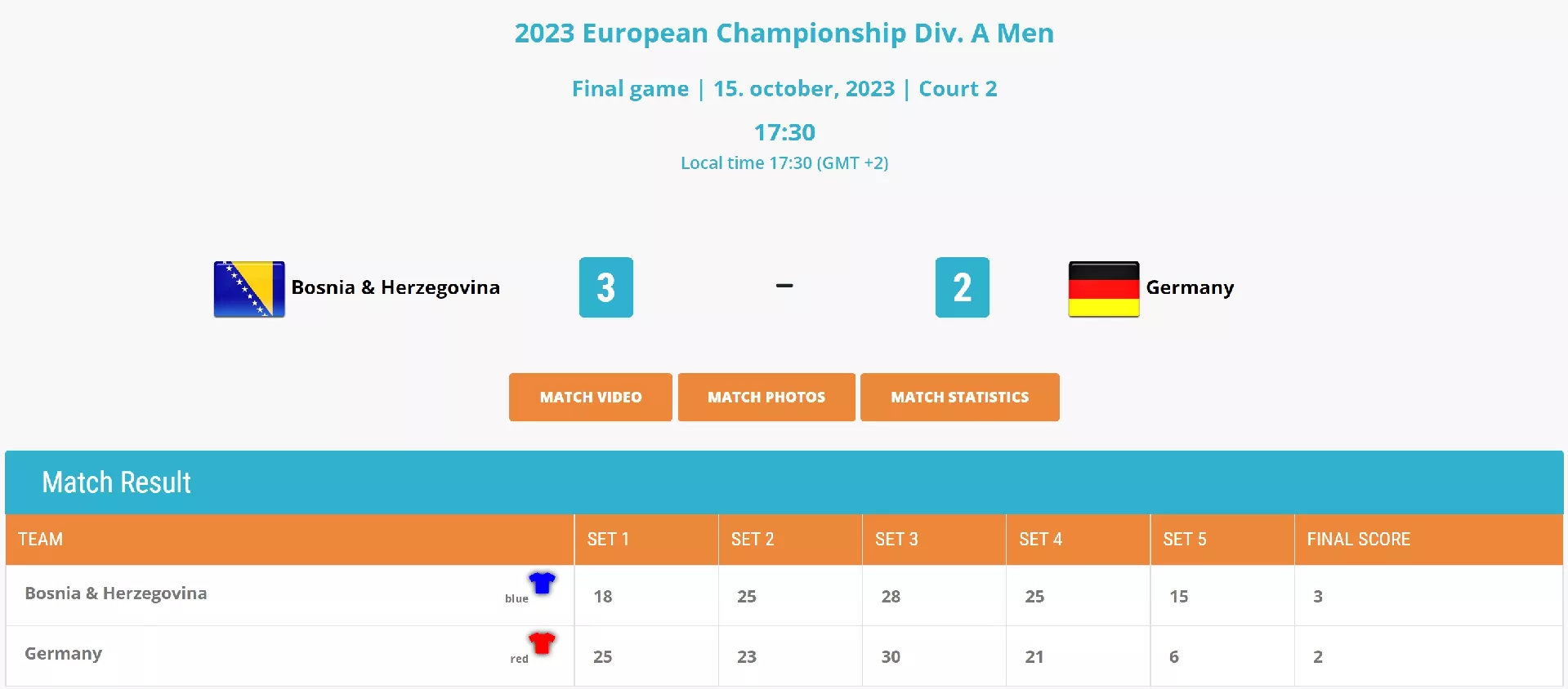 U finalu Evropskog prvenstva u Italiji naši Zlatni ljiljani večeras su nakon velike i teške borbe savladali Nijemce rezultatom 3:2. Po setovima je bilo 18-25, 25-23, 28-30, 25-21, 15-6.