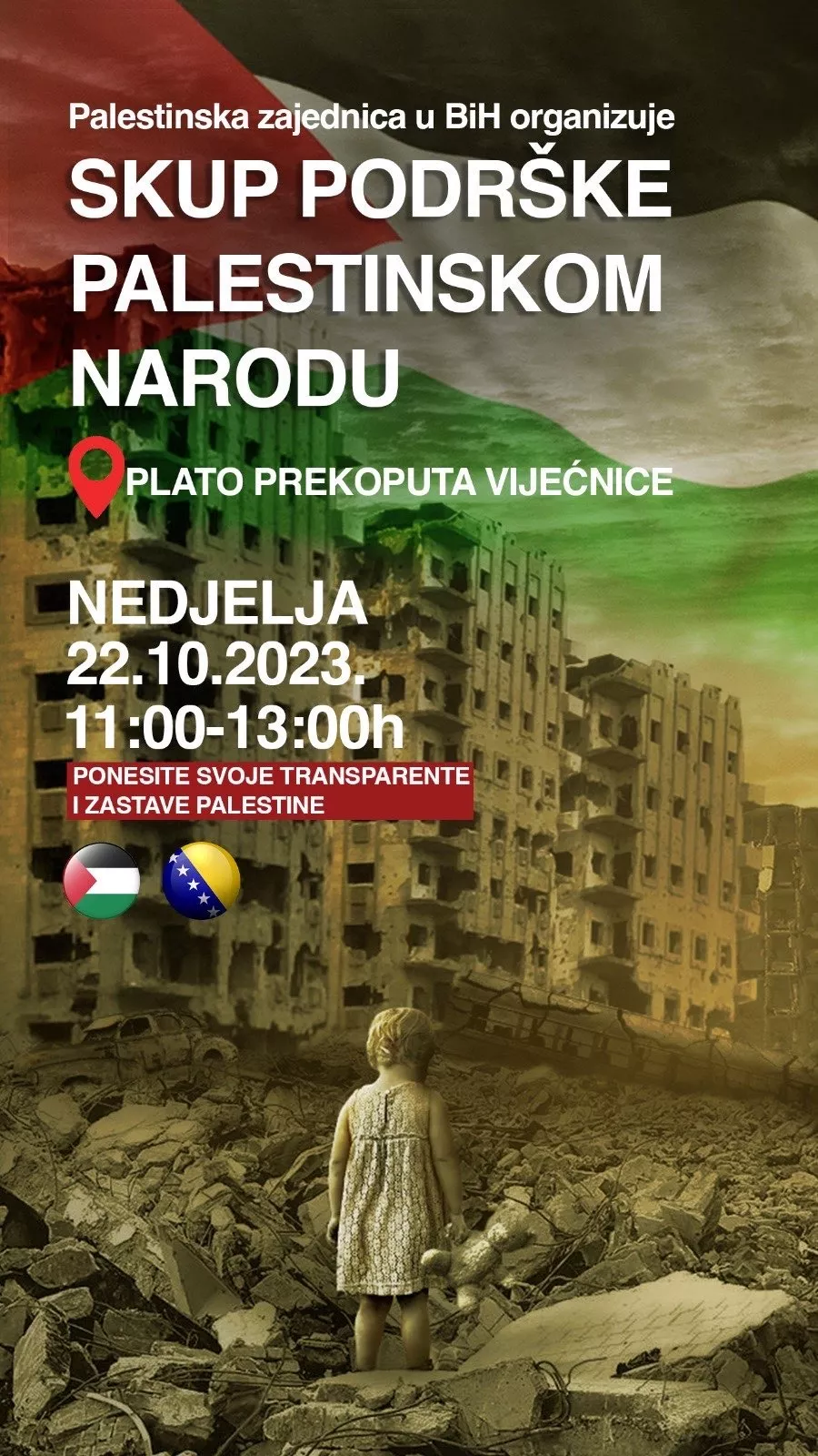 Osjećamo veliku podršku u Bosni i Hercegovini, od svih građana i naroda ove prijateljske zemlje, te još jednom pozivamo građane da nam se pridruže u nedjelju, 22. oktobra na velikom skupu za mir u Palestini, a protiv terorizma i agresije izraelske okupatorske sile, koji će biti održan u Sarajevu na platou preko puta Vijećnice sa početkom u 11 sati", saopštilo je ovo udruženje.