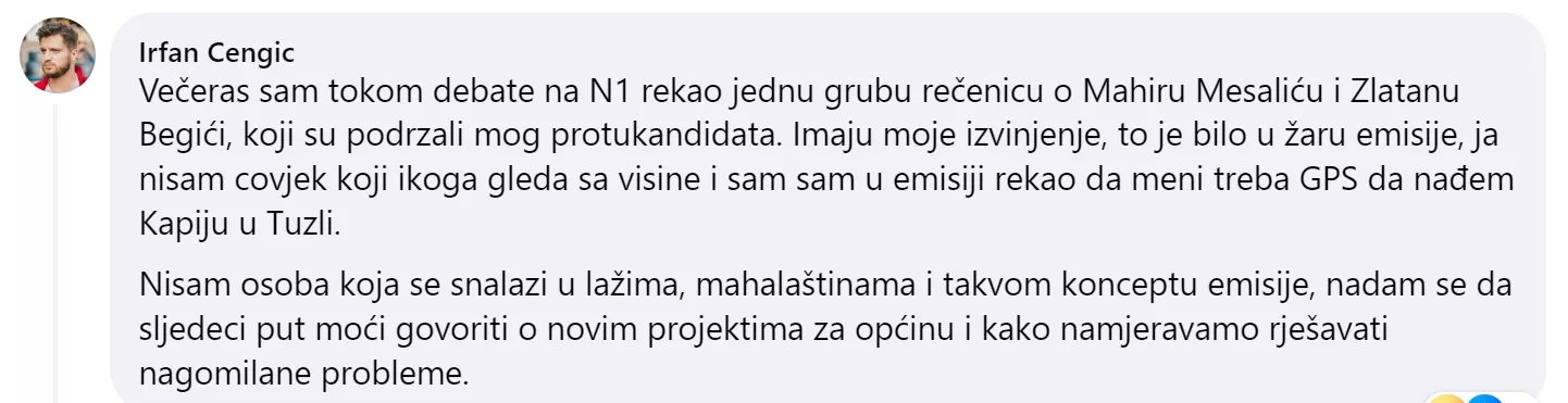 "Večeras sam tokom debate na N1 rekao jednu grubu rečenicu o Mahiru Mešaliću i Zlatanu Begiću, koji su podržali mog protukandidata.