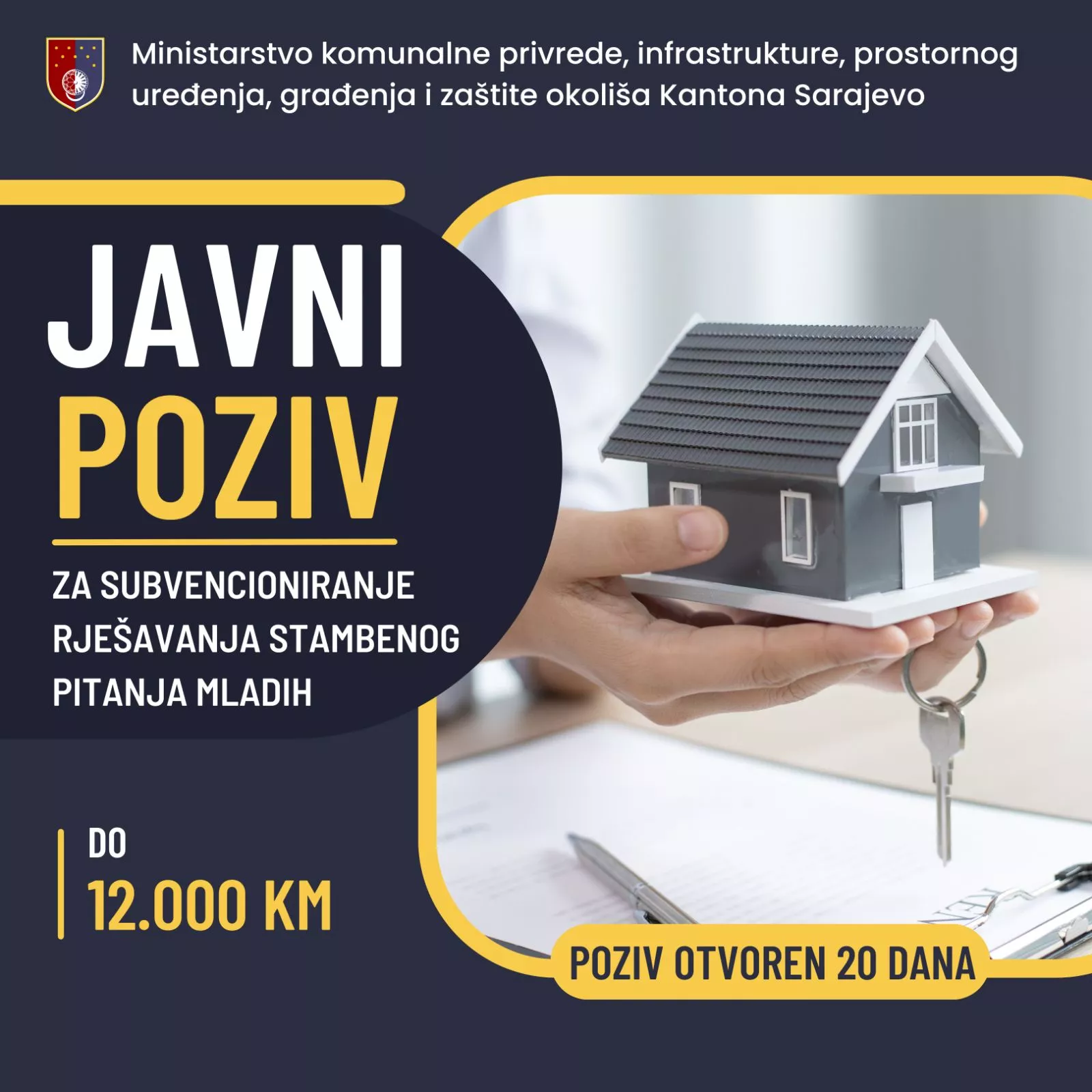 (Patria) - Ministarstvo komunalne privrede, infrastrukture, prostornog uređenja, građenja i zaštite okoliša Kantona Sarajevo objavilo je Javni poziv za subvencioniranje rješavanja stambenog pitanja mladih.
