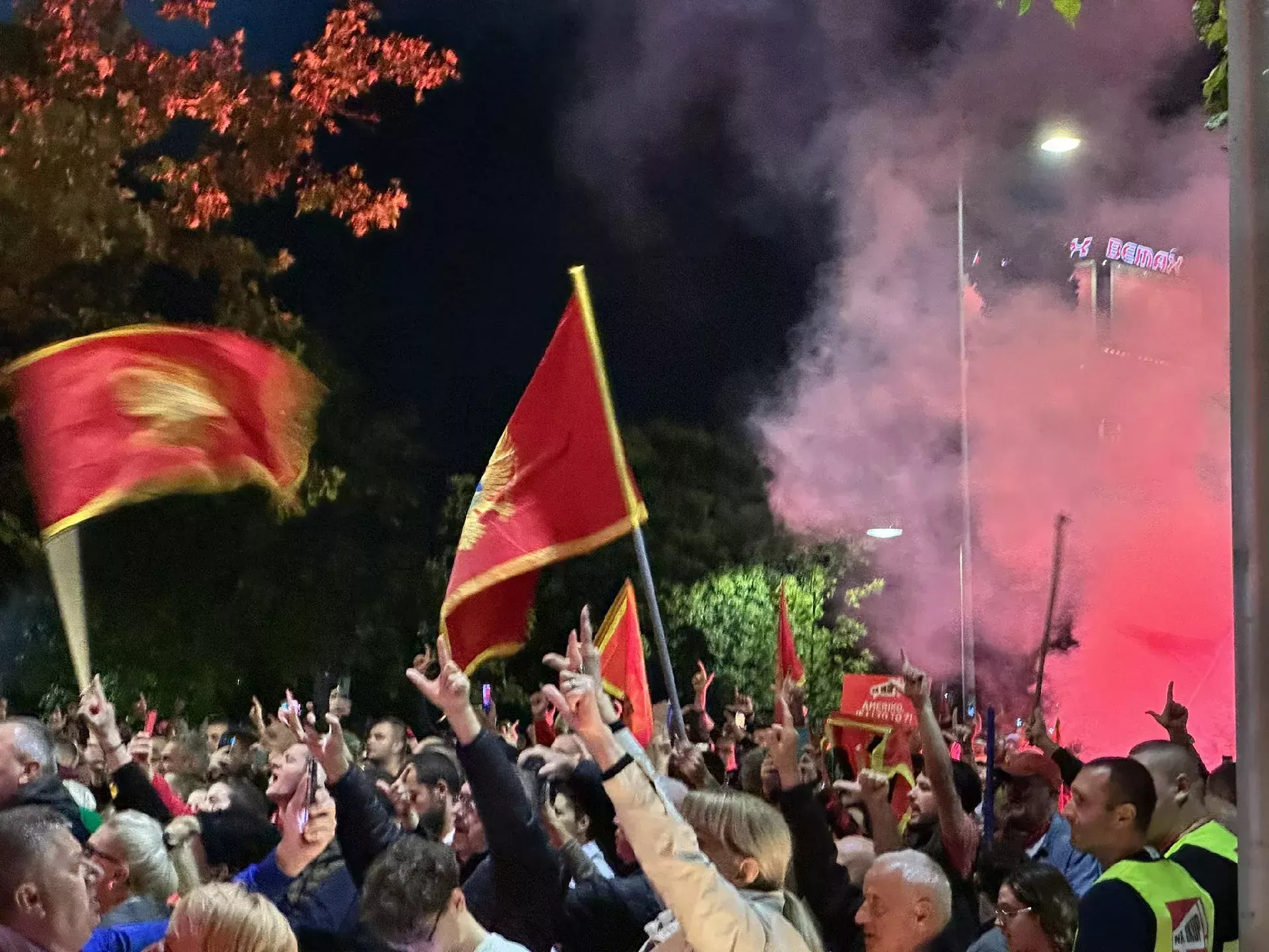 Okupljeni nose crnogorske zastave, i pjevaju himnu Crne Gore “Oj, svijetla majska zoro!”