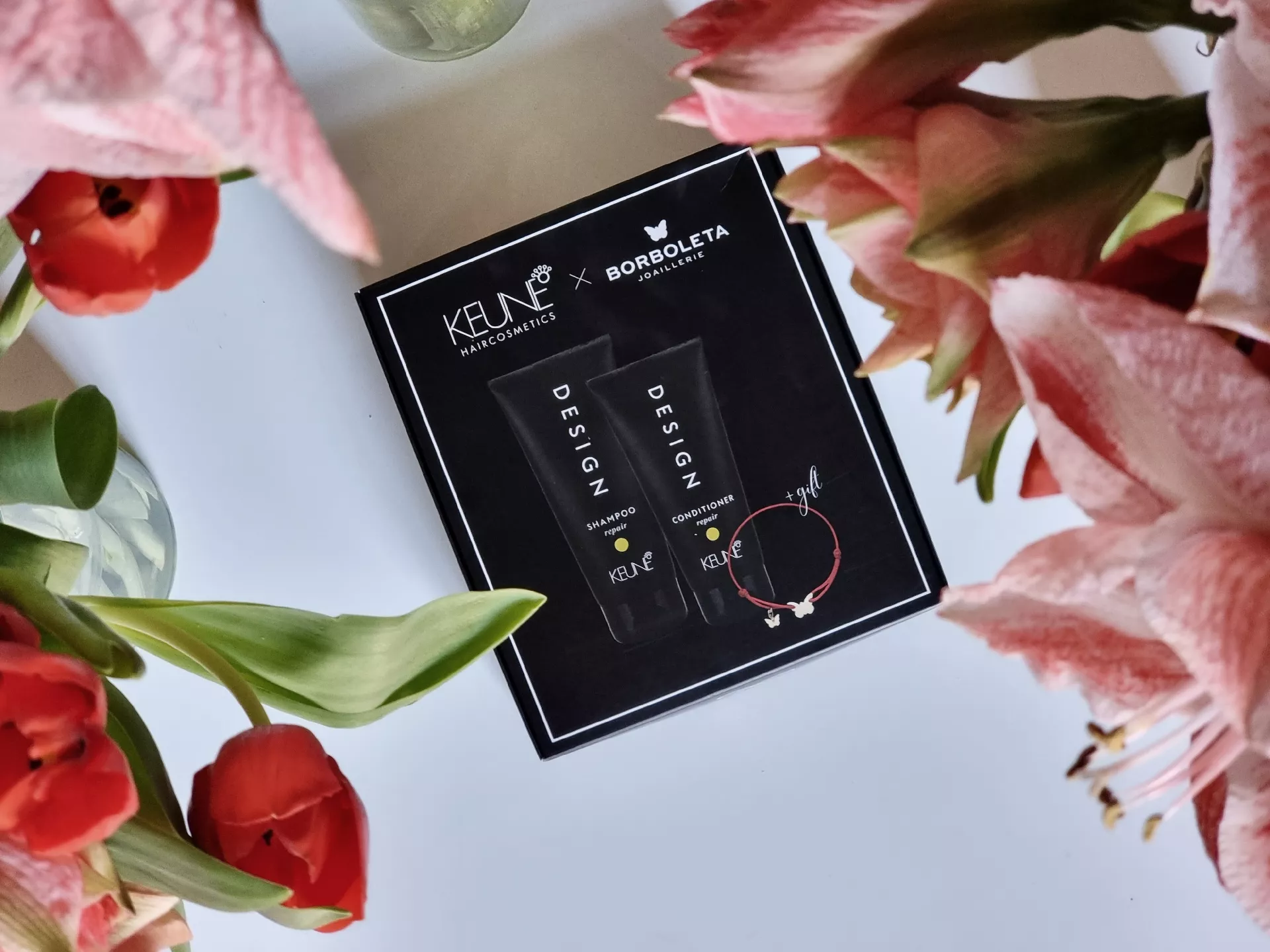 Kutija Keune x Borboleta donosi spoj izvrsne njege kose i besprijekornog stila. U elegantnu su crnu kutiju zapakovani Design by Keune šampon i regenerator, a u svakom se pakovanju nalazi i poklon, među trendsetericama iznimno popularna narukvica brenda Borboleta.