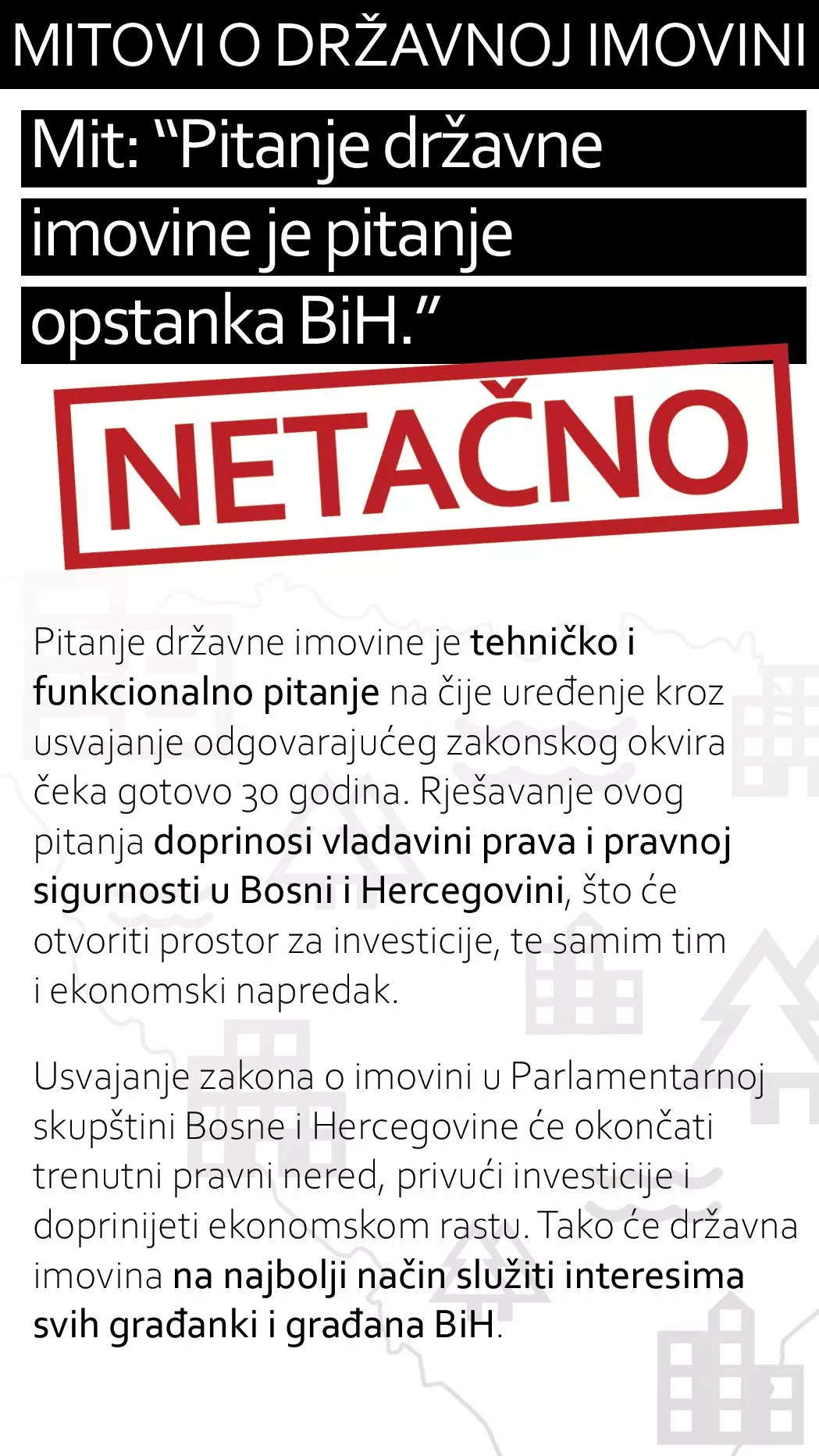 Također, navodi se i da je tvrdnja kako je pitanje državne imovine pitanje opstanka BiH netačna, odnosno mit.