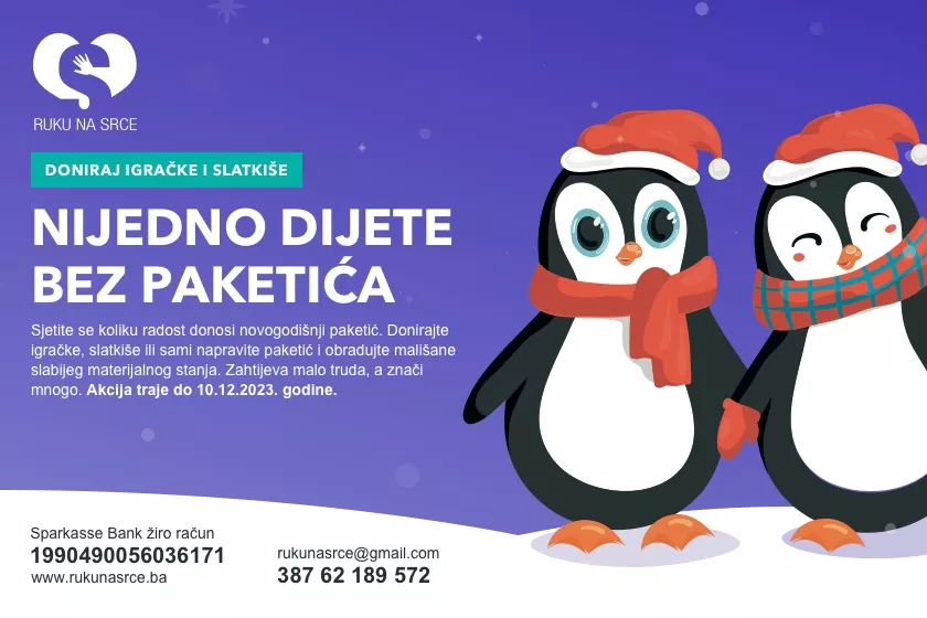 Ukoliko niste u mogućnosti lično dostaviti svoj prilog, na žiro račun Udruženja (1990490056036171, Sparkasse Bank) možete uplatiti i novčane donacije sa naznakom: Za akciju “Nijedno dijete bez paketića”. Rok za prikupljanje svih priloga je 10. decembar 2023. godine.
