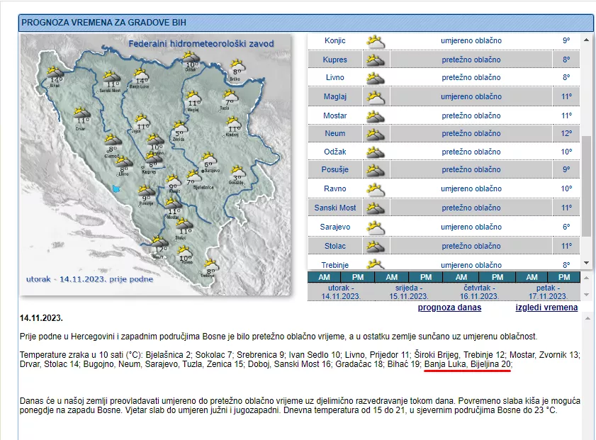 Temperature zraka u 10 sati (°C): Bjelašnica 2; Sokolac 7; Srebrenica 9; Ivan Sedlo 10; Livno, Prijedor 11; Široki Brijeg, Trebinje 12; Mostar, Zvornik 13; Drvar, Stolac 14; Bugojno, Neum, Sarajevo, Tuzla, Zenica 15; Doboj, Sanski Most 16; Gradačac 18; Bihać 19; Banja Luka, Bijeljina 20.
