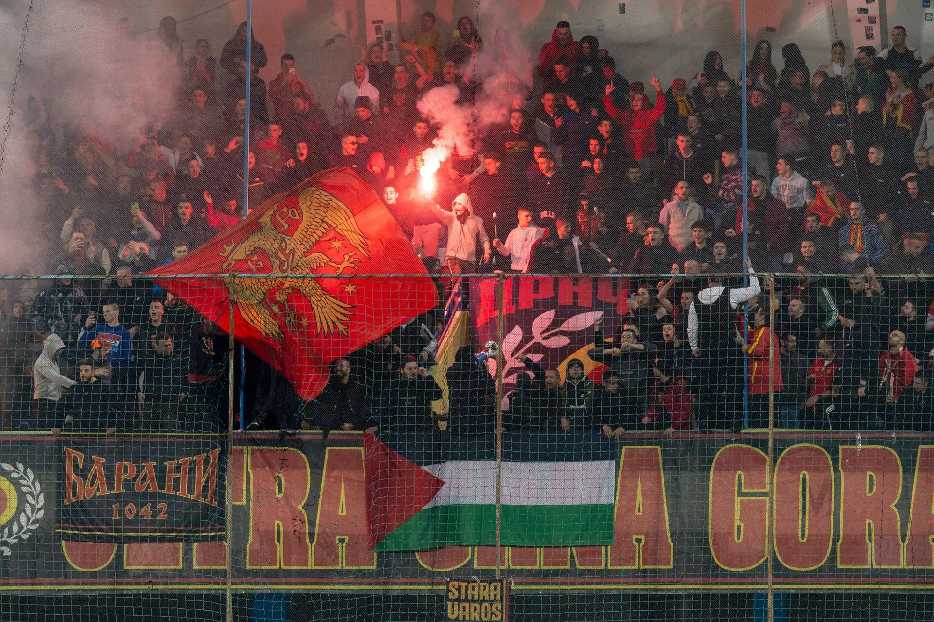 Preko centralne zastave navijačke grupe "Ultra Crna Gora", na sjevernoj tribini podgoričkog stadiona, sinoć je raširena zastava Palestine, na čijoj je teritoriji u ofanzivi izraelske vojske protiv terorističke organizacije Hamas stradao veliki broj civila.