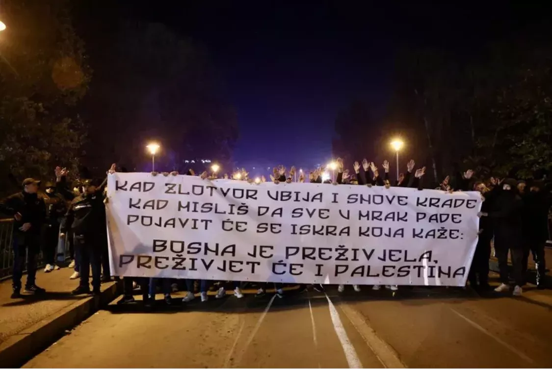 Najvatrenija navijačka grupa, BH Fanaticosi, su u korteu krenuli prema stadionu, a nosili su transparent na kojem je poruka: “Kad zlotvor ubija i snove krade, kad misliš da sve u mrak pade, pojavit će se iskra koja kaže: Bosna je preživjela, preživjet će i Palestina.”