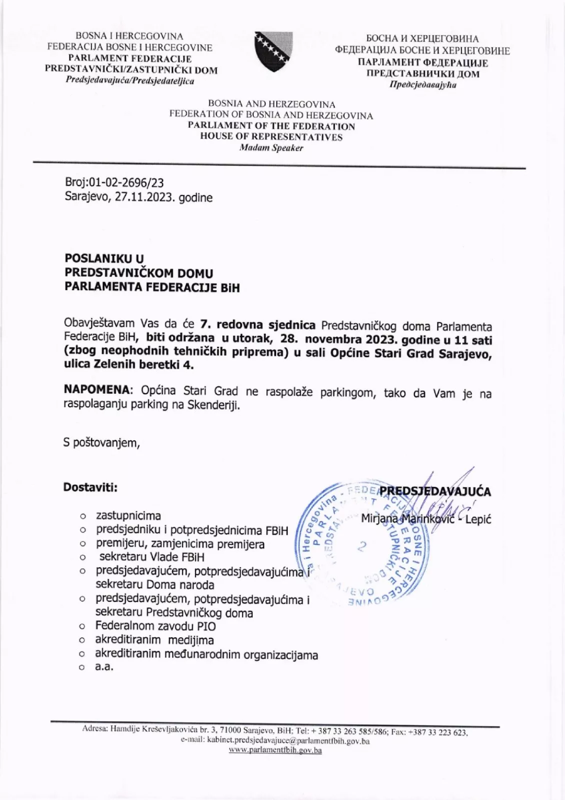 Sjednica Predstavničkog doma Parlamenta FBiH bit će održana u sali Općine Stari Grad Sarajevo.