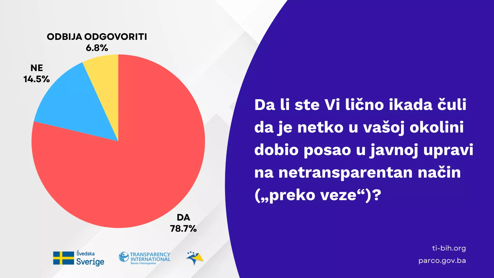 (Patria) - Čak 68,8% građana BiH nema povjerenje u rad zaposlenih u javnoj upravi a većina njih (82,9%) smatra da se novac iz budžeta ne troši na pravi način. Na manjak povjerenja uticalo je i to što sve više građana vidi korupciju u javnoj upravi, gdje gotovo četiri petine ispitanika (78,6%) vjeruje da se do posla u ovom sektoru dolazi “preko veze”. To su podaci iz istraživanja javnog mnijenja u cijeloj Bosni i Hercegovini koje je Transparency International u BiH (TI BiH) predstavio danas na konferenciji pod nazivom “Dvije decenije reforme javne uprave u Bosni i Hercegovini – (ne)naučene lekcije”.