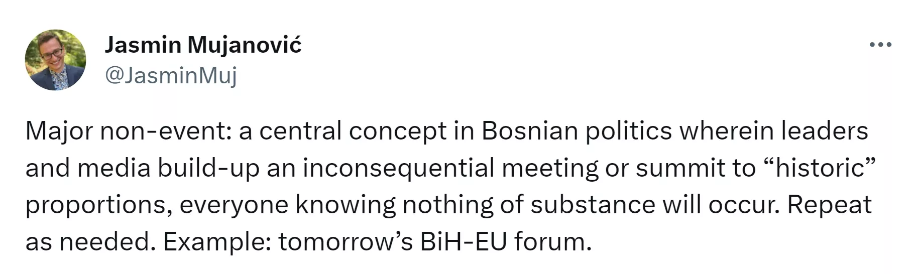 (Patria) - Politički analitičar Jasmin Mujanović oglasio se na društvenim mrežama uoči sutrašnjeg drugog po redu Političkog foruma na visokom nivou između EU i BiH.