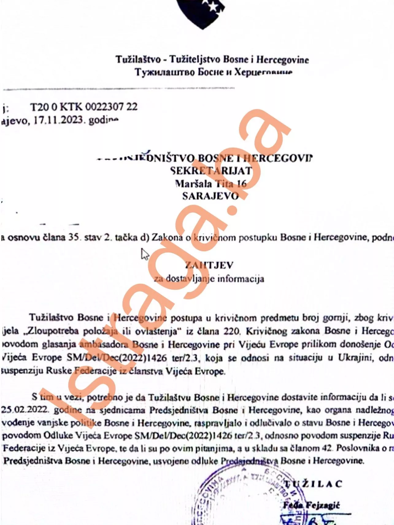 Postupajući tužilac u ovom slučaju je Feđa Fejzagić, a u novembru ove godine zatražio je od Predsjedništva BiH informaciju da li su na sejdnicama Predsjedništva BiH odlučivalo o stavu BiH, kao organa nadležnog za vođenje vanjske politike BiH.
