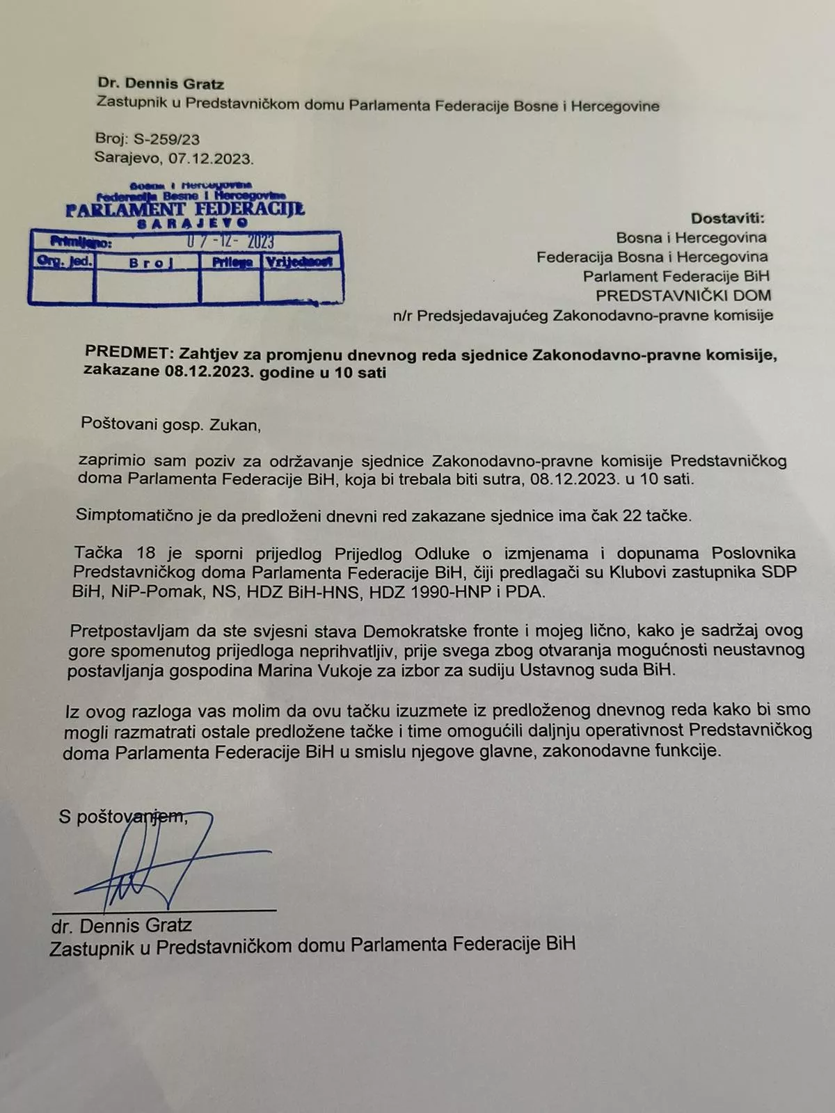 Gratz je tražio da se s dnevnog reda izuzme Prijedlog Odluke o izmjenama i dopunama Poslovnika Predstavničkog doma Parlamenta FBiH, čiji predlagači su klubovi zastupnika SDP BiH, NiP-Pomak, NS, HDZ BiH-HNS, HDZ 1990-HNP i PDA, koji otvara mogućnost neustavnog postavljanja Marina Vukoje za sudiju Ustavnog suda BiH.