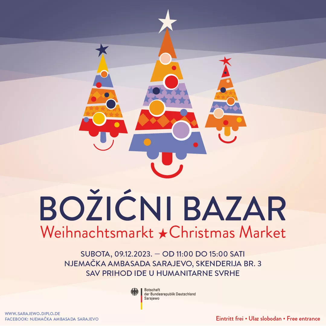(Patria) - Božićni bazar koji organizuju uposlenice i uposlenici Njemačke ambasade Sarajevo održat će se u subotu, 09. decembra 2023., od 11:00 do 15:00 sati u zgradi Njemačke ambasade, na adresi Skenderija 3.