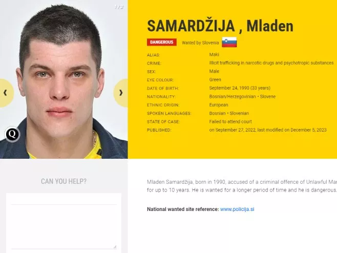 Iz MUP-a Rs navode da je M.S. državljanin Slovenije i BiH i da je za njim raspisana Interpolova potjernica Slovenije za krivično djelo neovlaštena proizvodnja i promet opojnih droga.
