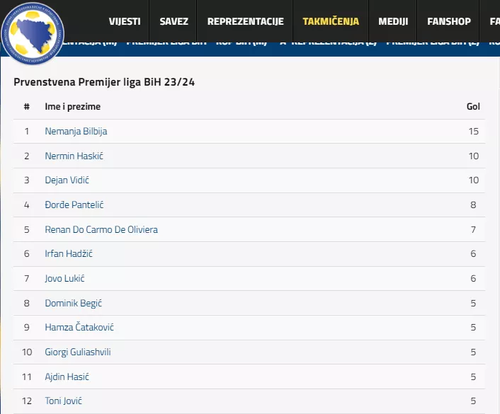 Iza njega su Veležovac Nemin Haskić i fudbaler dobojske Sloge Dejan Vidić, obojica sa po 10 golova.