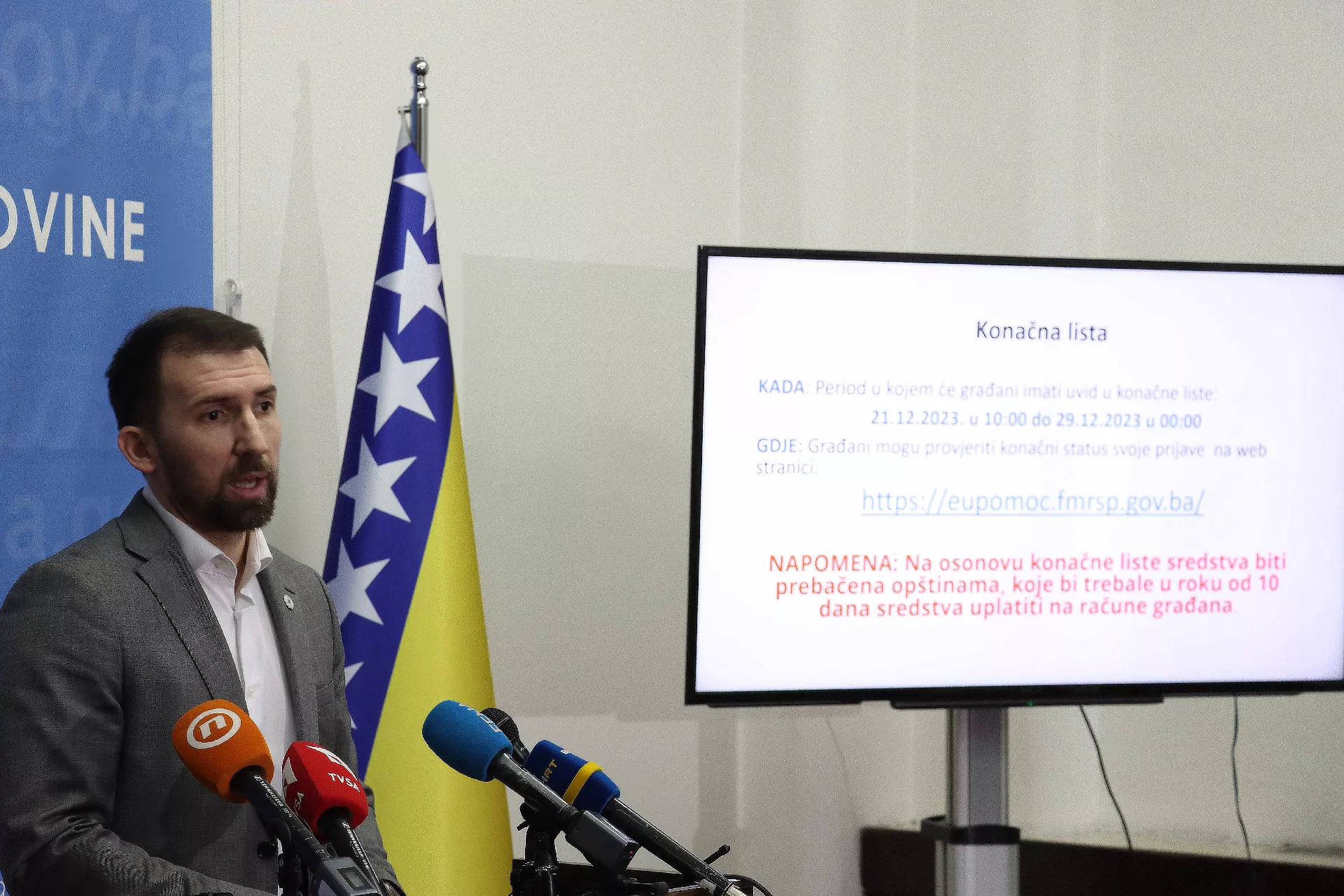 (Patria) - Federalni ministar rada i socijalne politike Adnan Delić objavio je danas konačne rezultate javnog poziva za selekciju domaćinstava za podjelu EU pomoći s ciljem prevazilaženja energetske krize, a na konačnoj listi, nakon unesenih prigovora na preliminarnu listu, ukupno je 154.779 domaćinstava koja su ispunila kriterije definisane Javnim pozivom, što je 2.291 više domaćinstava u odnosu na preliminarnu listu na kojoj je bilo 152.488.