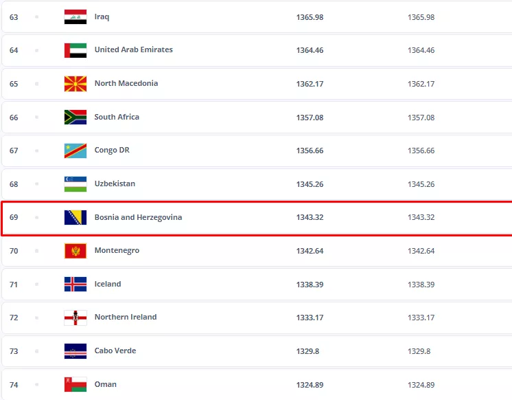 (Patria) - Fudbalska A reprezentacija Bosne i Hercegovine nalazi se na 69. mjestu najnovije rang-liste Svjetske fudbalske federacije (FIFA).