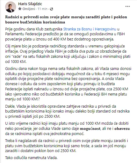 Treba li naglašavati da radnici u privredi, osim svoje plate, moraju zaraditi i platu svim budžetskim korisnicima koji samo troše, a sada im još moraju zaraditi i dodatni poklon bon od 2.500 KM.