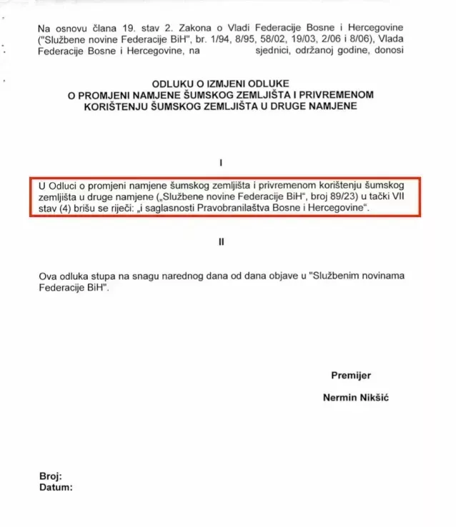 “U Odluci o promjeni namjene šumskog zemljišta i privremenog korištenja šumskog zemljišta u druge namjene, u tački VII, stav 4 brišu se riječi “i saglasnost Pravobranilaštva Bosne i Hercegovine”, piše u odluci koju je prošlog petka, opet bez obavještavanja javnosti, usvojila Vlada FBiH sa Nerminom Nikšićem na čelu.
