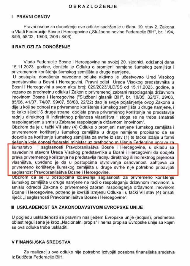 “Obzirom da je u tački VII stav (4) Odluke o promjeni namjene šumskog zemljišta i privremenom korištenju šumskog zemljišta u druge namjene propisano da se dozvola za korištenje šumskog zemljišta za svrhe iz stav (1) te tačke izdaje u formi rješenja koje donosi federalni ministar uz prethodno mišljenje Federalne uprave za šumarstvo i saglasnosti Pravobranilaštva Bosne i Hercegovine, u skladu sa navedenim stavom Ureda Visokog predstavnika u Bosni i Hercegovini da dodjela prava privremenog korištenja ne predstavlja radnju direktnog ili indirektnog prijenosa vlasništva, utvrdeno je da u postupcima utvrdivanja osnovanosti zahtjeva za privremeno korištenje šumskog zemljišta u druge svrhe nije potrebno pribavljati saglasnost Pravobranilaštva Bosne i Hercegovine”, naveo je Nikšić u obrazloženju odluke.