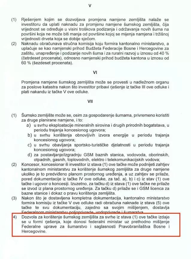 Dalje piše da “dozvola za korištenje šumskog zemljišta za svrhe iz stava (1) ove tačke izdaje se u formi rješenja, koje donosi federalni ministar uz prethodno mišljenje Federalne uprave za šumarstvo i saglasnosti Pravobranilaštva Bosne i Hercegovine”.