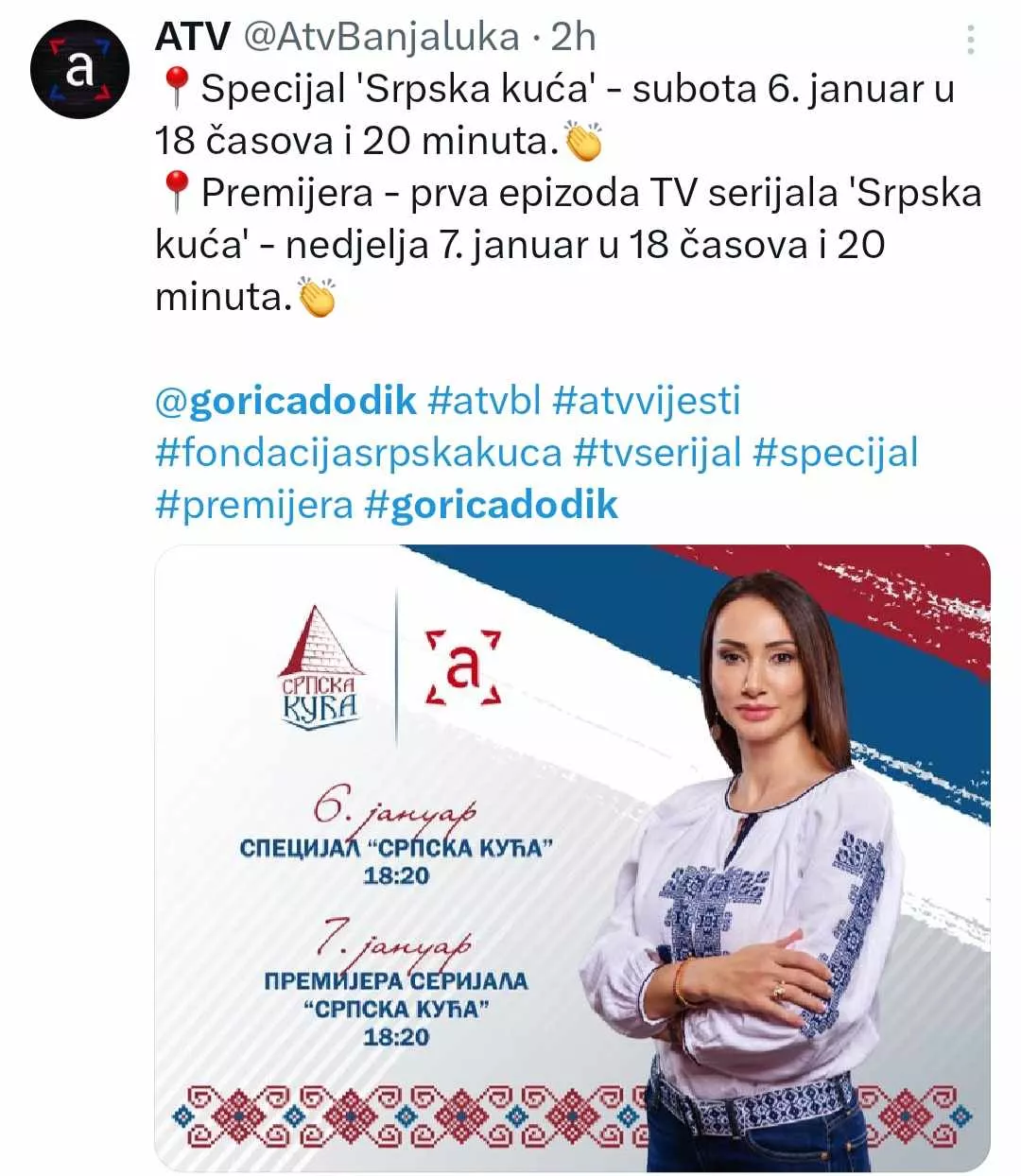 Upravo ATV ovih dana u svom programu i na društvenim mrežama reklamira emitovanje specijalne emisije i prve epizode 'Srpske kuće' koje su na programu ATV-a 6. i 7. januara 2024. godine.