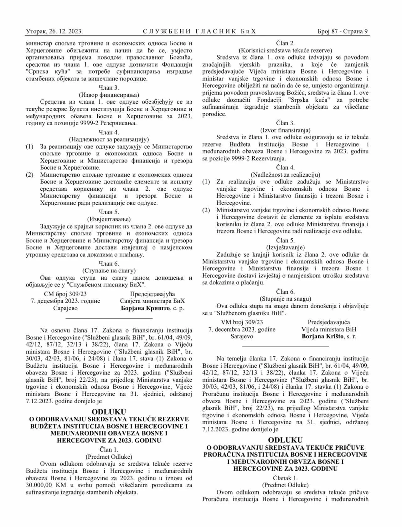Vijeće ministara BiH na sjednici 7. decembra donijelo je odluku o odobravanju sredstava tekuće rezerve budžeta institucija BiH u iznosu od 30.000 KM koje su doznačene Fondaciji 'Srpska kuća' na čijem je čelu Gorica Dodik, kćerka predsjednika Rs Milorada Dodika. Odluka je donesena na prijedlog Ministarstva vanjske trgovine i ekonomskih odnosa BiH na čijem je čelu kadar SNSD-a Staša Košarac.