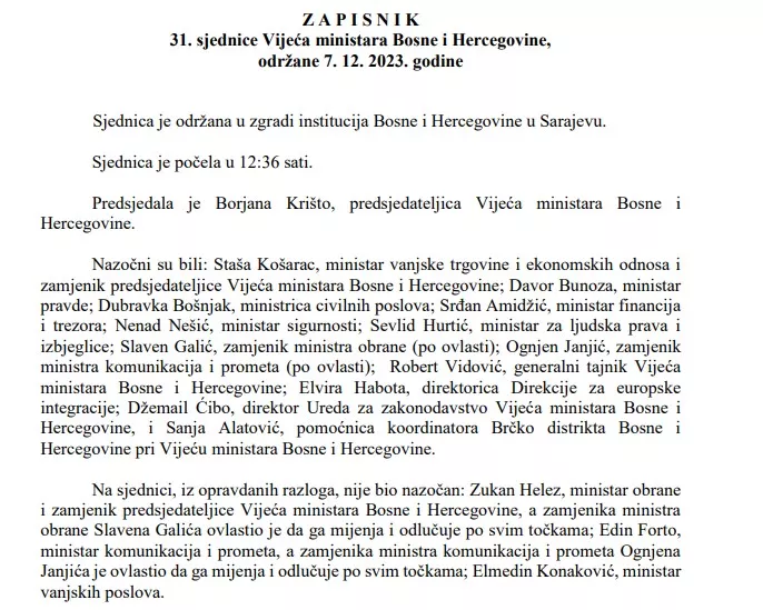 S obzirom da se odluke Vijeća ministara BiH ne mogu usvojiti ako za njih ne glasa najmanje jedan predstavnik tri konstitutivna naroda, i za ovu odluku bio je odlučujući glas Sevlida Hurtića, ministra za ljudska prava i izbjeglice. Potvrđuje to i Zapisnik sa održane sjednice 7. decembra na kojoj je spisak prisutnih. Tog dana sjednici nisu prisustvovali Zukan Helez, Elmedin Konaković i Edin Forto. Jedini Bošnjak koji je imao pravo glasa na toj sjednici je Hurtić.