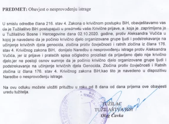 (Patria) - Tužilac Tužilaštva BiH Oleg Čavka donio je naredbu o nesprovođenju istrage protiv Aleksandra Vučića za djela genocid, zločin protiv čovječnosti i ratnih zločina iz Člana 176. stav 4 Krivičnog zakona BiH, potvrđeno je za Patriju.