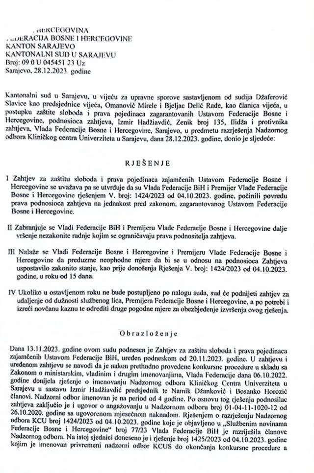 “Zabranjuje se Vladi FBiH i premijeru Vlade FBiH dalje vršenje nezakonite radnje kojim se ograničavaju prava podnositelja zahtjeva. Nalaže se Vladi FBiH i premijeru da preduzme neophodne mjere da bi se u odnosu na podnosioca Zahtjeva uspostavilo zakonito stanje, kao prije donošenja Rješenja od 4.10.2023. godine, u roku od 15 dana. Ukoliko u ostavljenom roku ne bude postupljeno po nalogu, Sud će podnijeti zahtjev za udaljavanje od dužnosti službenog lica, premijera FBiH, a po potrebi i izreći novčanu kaznu”, navedeno je u Rješenju Kantonalnog suda u Sarajevu.