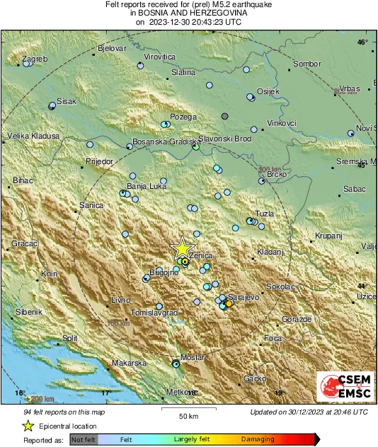 Epicentar je bio 63 kilometra od Sarajeva, odnosno 10 kilometara od Zenice.