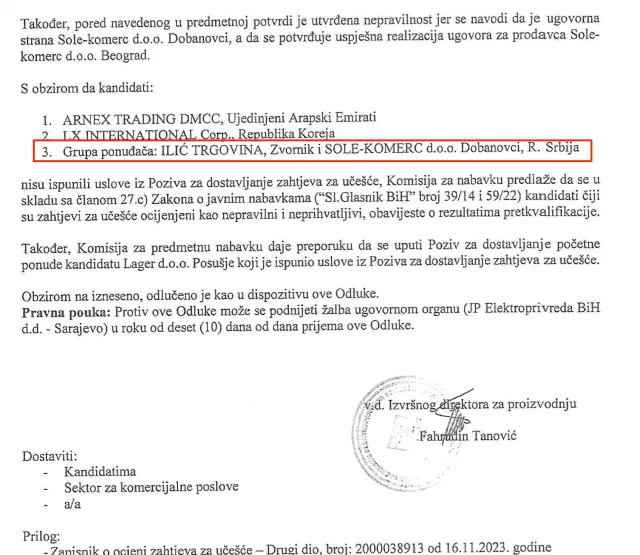 Podsjetimo, Elektroprivreda BiH je u oktobru i novembru prošle godine provela postupak nabavke 400 hiljada tona uglja za potrebe Termoelektrane Kakanj. Na tender su se tacda prijavile četiri firme: Lager d.o.o. Posušje, Arnex Trading iz Ujedinjenih Emirata, LX International iz Južne Koreje, te konzorcij Ilić trgovina Zvornik i Sole Komerc iz Srbije. Kompanija Lager je HDZ-u bliski biznismen iz Posušja Milenko Bašić dok je vlasnik obje kompanije koje su činile Konzorcij, Ilić trgovina i Sole Komerc, Slobodan Ilić, srpski biznismen porijeklom iz Banovića. Ilićeve kompanije godinama su glavni partner RMU Banovići i uglavnom preko njegovih kompanija Mirsad Kukić kontrolira izvoz banovićkog uglja za Srbiju.
