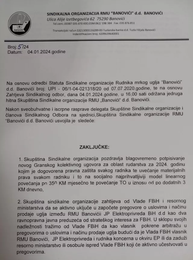 Ubrzo je direktora RMU Banovići podržao i Sindikat koji je pod Kukićevom kontrolom.