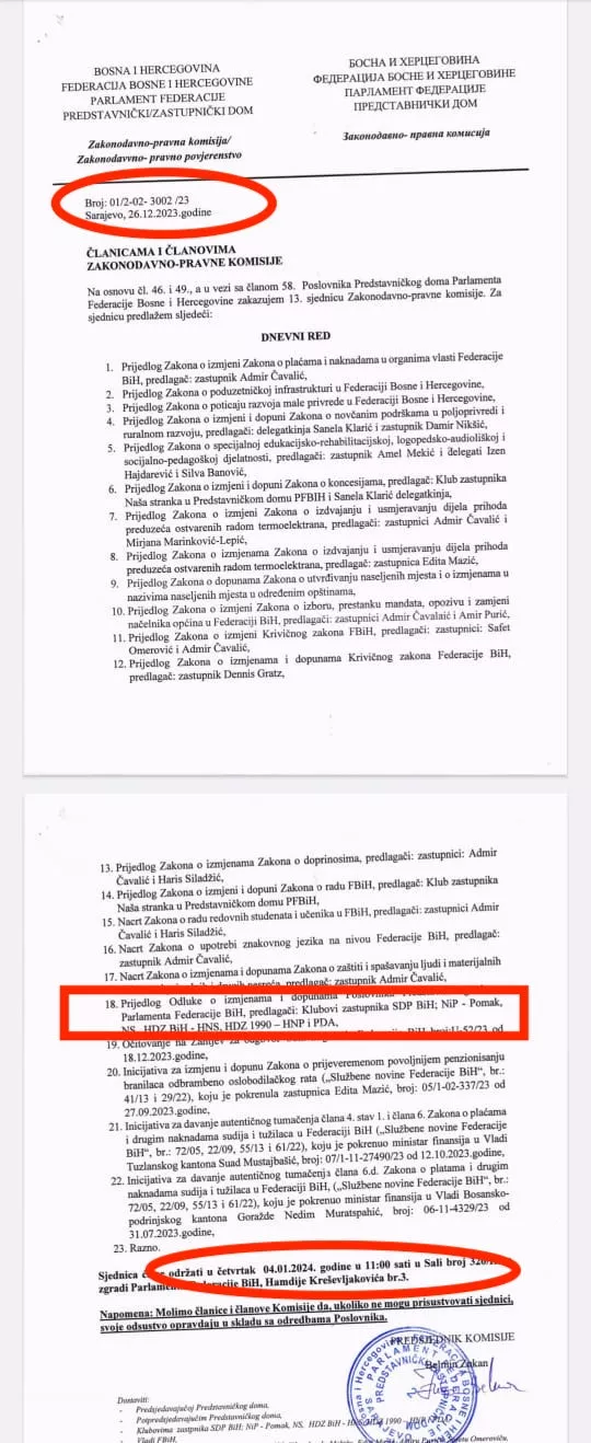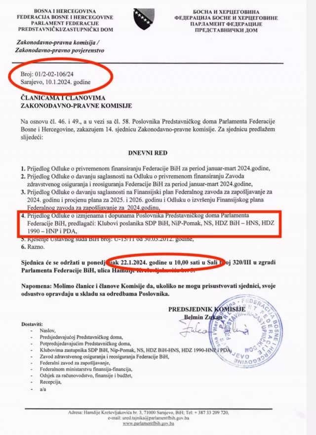Naime, SDP-ovac Belmin Zukan zakazao je za 22. januar sjednicu Zakonodavno-pravne komisije Predstavničkog doma FBiH sa samo četiri tačke dnevnog reda i to – Prijedlog odluke o privremenom finansiranju Federacije BiH, Prijedlog odluke o davanju saglasnosti na finansijski plan Federalnog zavoda za zapošljavanje, Prijedlog Odluke o izmjenama i dopunama Poslovnika o radu Predstavničkog doma FBiH, Rješenje Ustavnog suda BiH od 30.3. 2012. godine i razno.