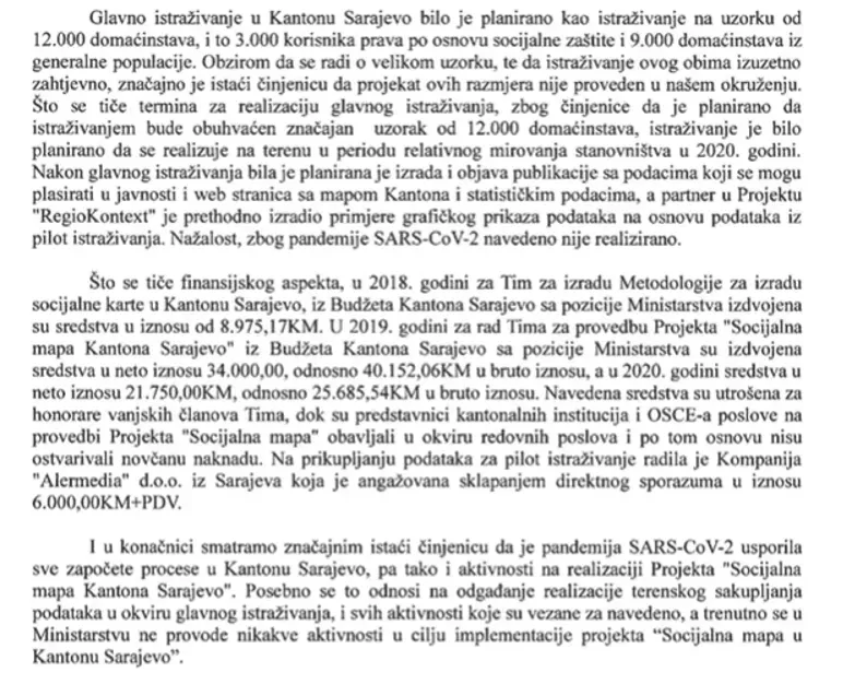 Za rad timova koji su formirani 2018. i 2019. godine, a koje je činilo 18 članova utrošeno je 74.812 KM. Jedan tim je bio zadužen za Metodologiju za izradu socijalne karte, a drugi za provedbu projekta „Socijalna mapa KS“. Rok za provedbu projekta drugog tima bio je 30. juni 2020. godine.