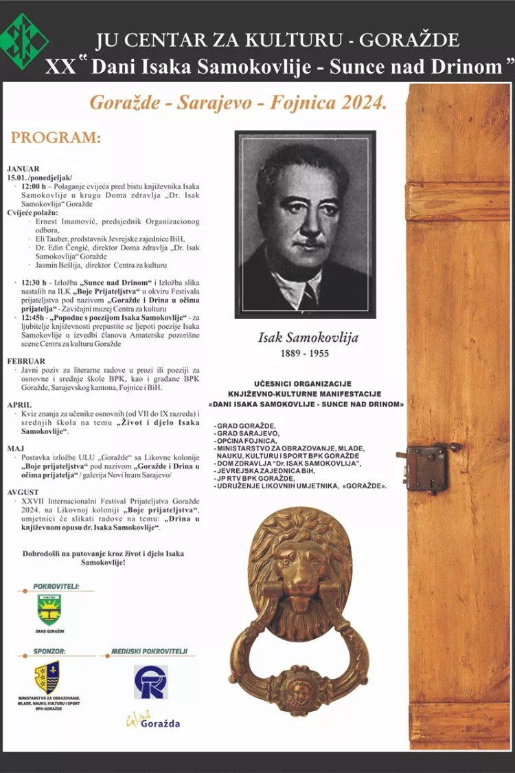 (Patria) - Jubilarna 20. manifestacija "Dani Isaka Samokovlije - Sunce nad Drinom" u organizaciji Javne ustanove Centar za kulturu Goražde počinje danas u 12 časova polaganjem cvijeća na bistu ispred Doma zdravlja u Goraždu koja nosi ime Isaka Samokovlije.