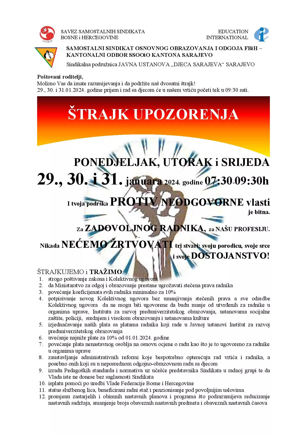 (Patria) - Skupština povjereništva Samostalnog sindikata osnovnog obrazovanja i odgoja FBiH - Kantonalni odbor KS je na redovnoj sjednici održanoj danas donio odluku po kojoj će 29., 30. i 31. januara 2024. od 07:30 do 09:30 sati biti održan štrajk upozorenja u svim javnim ustanovama osnovnog obrazovanja na području KS i u Javnoj ustanovi "Djeca Sarajeva" Sarajevo.