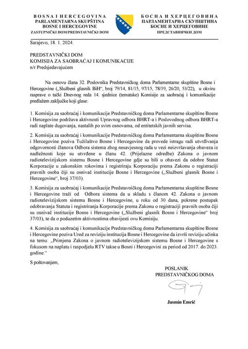 "Iako sam svjestan da nismo uradili ništa novo što može pomoći aktuelnoj negativnoj financijskoj situaciji BHRT-a i vrlo složenom stanju koje je nastalo zbog dugogodišnje političke opstrukcije i neprovođenja Zakona o javnom radiotelevizijskom sistemu Bosne i Hercegovine (Zakon) smatram da moramo identificirati politike i njihove predstavnike, članove Odbora JRTS-a BiH (Odbor sistema), koji spriječavaju provođenje Zakona neodgovornim i nesavjesnim radom", naveo je Emrić.