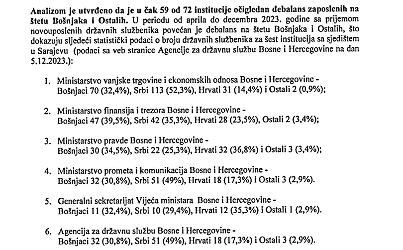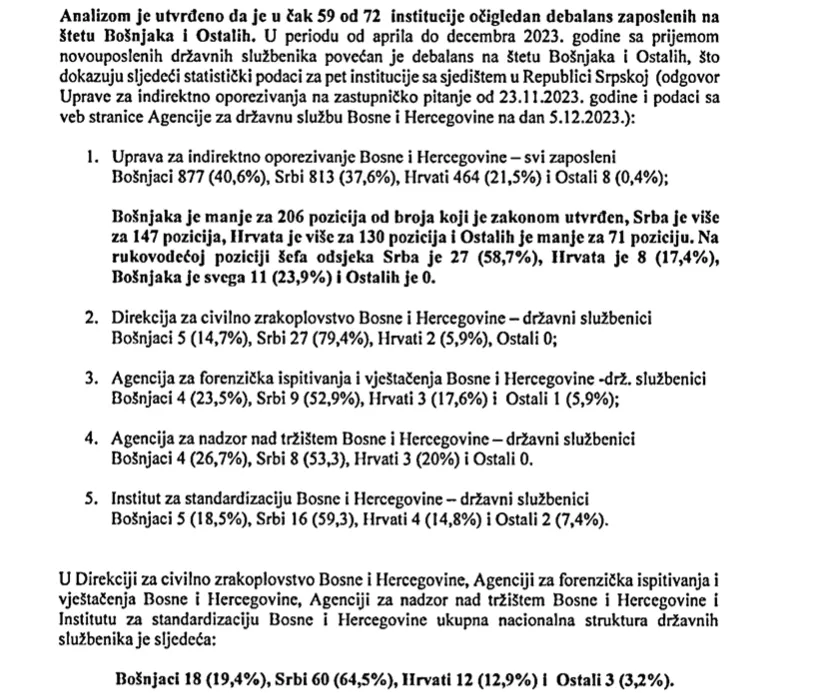 Te posljednja inicijativa kojom bi se pet institucija Bosne i Hercegovine sa sjedištem u Republici srpskoj obavezalo da osiguraju odgovarajuću nacionalnu zastupljenost državnih službenika u skladu sa Zakonom o upravi i Zakonom o državnoj službi, broj.